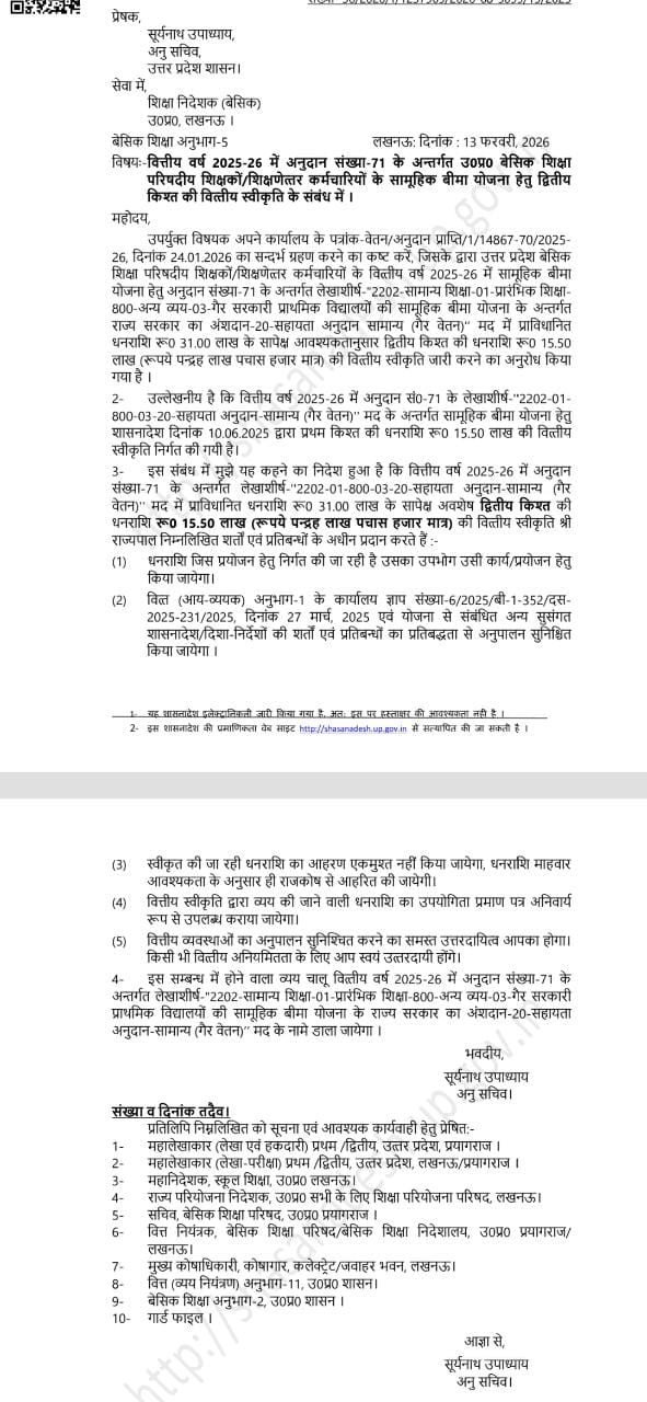 वित्तीय वर्ष 2025-26 में अनुदान संख्या-71 के अन्तर्गत उ०प्र० बेसिक शिक्षा परिषदीय शिक्षकों/शिक्षणेत्तर कर्मचारियों के सामूहिक बीमा योजना हेतु द्वितीय किश्त की वित्तीय स्वीकृति के संबंध में।