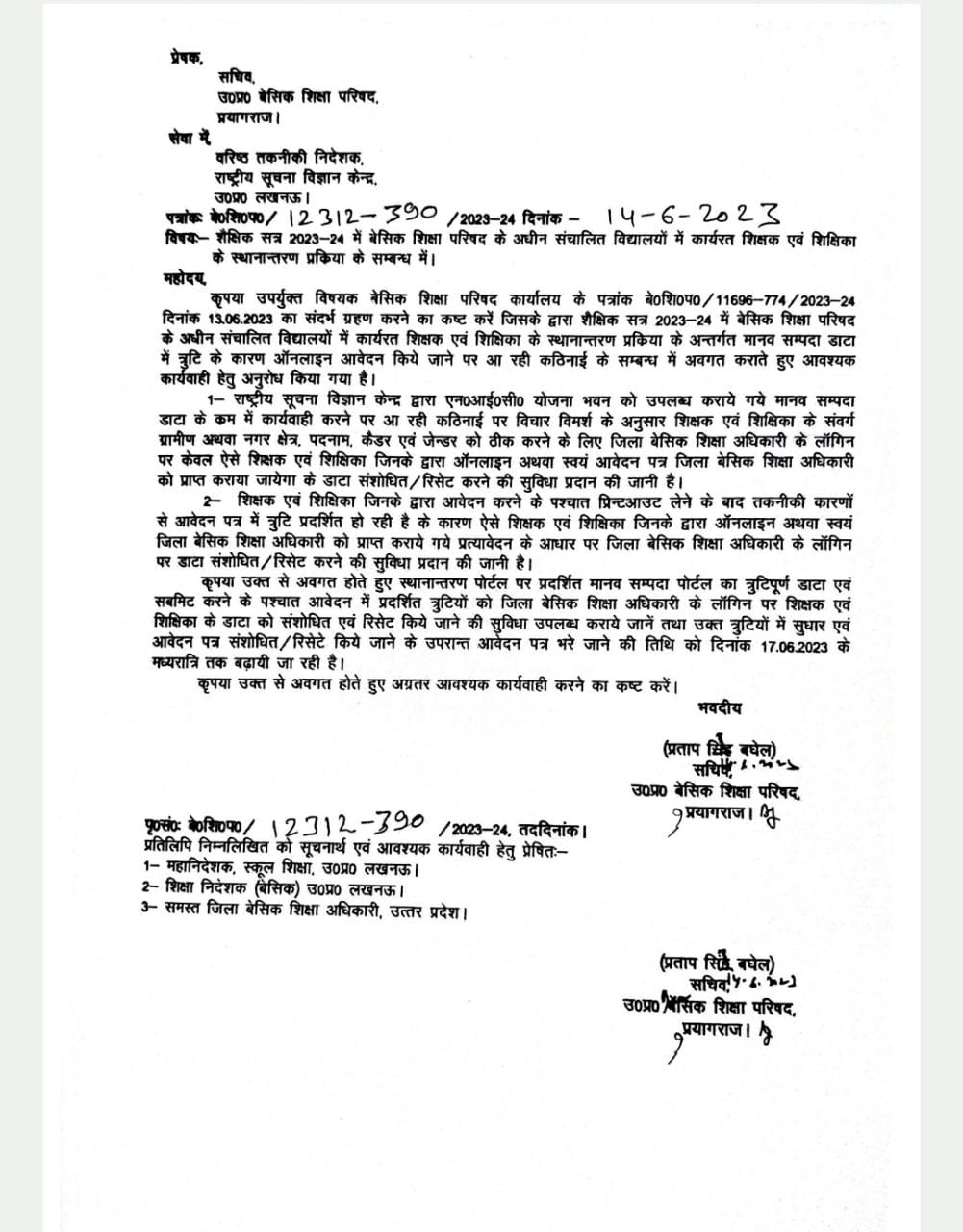 स्थानांतरण से जुड़े त्रुटिपूर्ण आवेदन को संशोधित कर अग्रिम कार्यवाही करने के सम्बंध में...