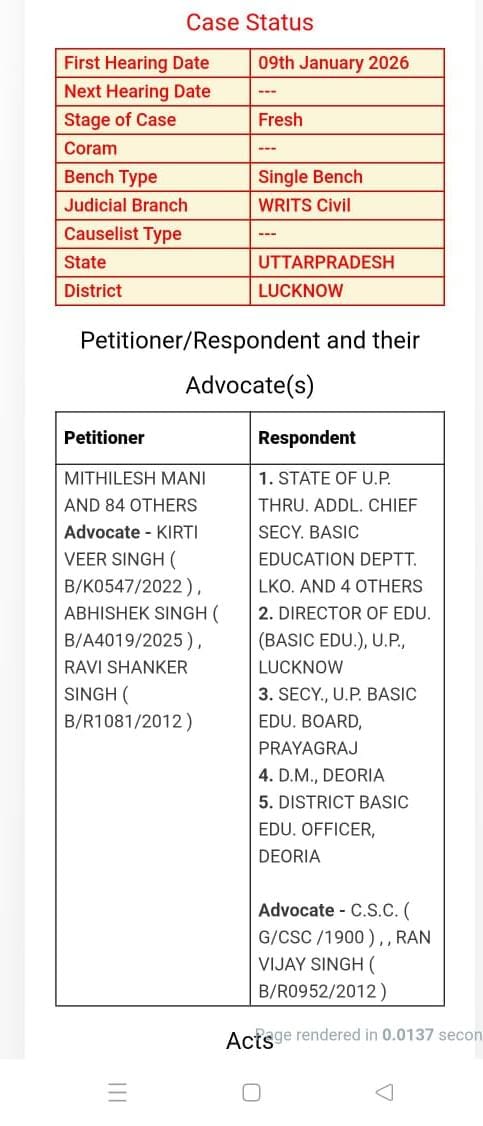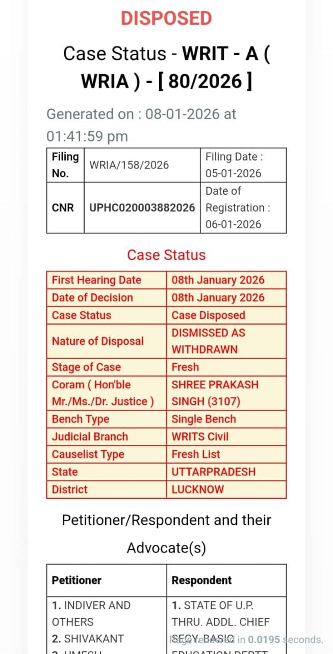 समायोजन पर आज हाईकोर्ट लखनऊ बेंच में याचिका 80/2026 मा जज श्री प्रकाश सिंह जी की बेंच में सुनवाई हुई है। इस याचिका को डिस्पोज कर दिया गया है। जिला बेसिक शिक्षा अधिकारी को प्रत्यावेदन देने को बोला गया है। कोर्ट ने हस्तक्षेप से इनकार कर दिया है।