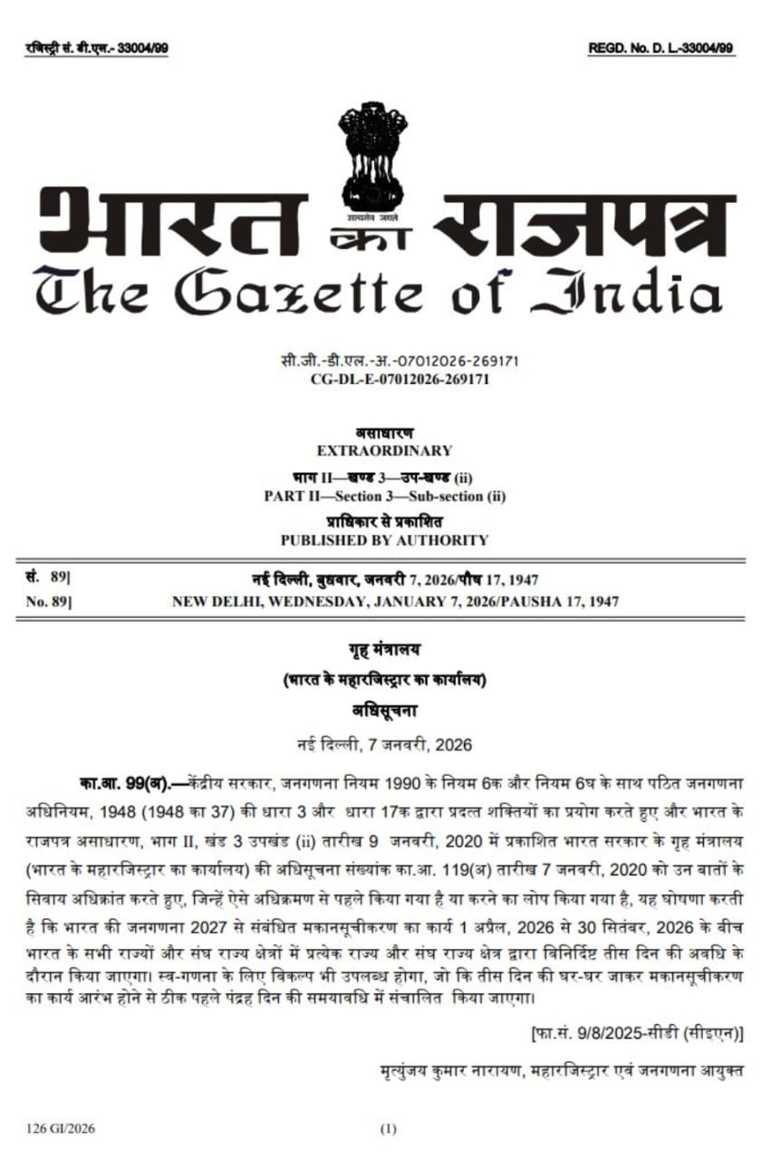 मकान सूचीकरण और मकानों की गणना (𝙷𝙻𝙾) हेतु अधिसूचना जारी