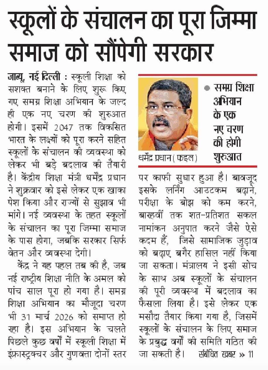 केंद्रीय शिक्षा मंत्री श्री धर्मेंद्र प्रधान जी द्वारा कल दिल्ली में HRD मंत्रालय की मीटिंग करने के बाद कहा है कि बेसिक स्कूलों में कम हो रहे नामांकन और घटती गुणवत्ता के दृष्टिगत समग्र शिक्षा अभियान के अंतर्गत बेसिक स्कूलों का संचालन व प्रवंधन स्थानीय स्तर पर पंचायत या समाज के वरिष्ठ जनों की सम..