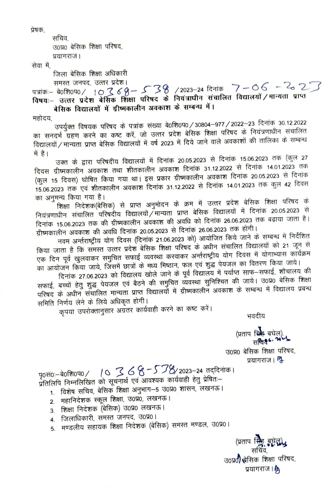 बेसिक शिक्षा विभाग उत्तर प्रदेश ने अत्यधिक गर्मी होने के कारण शिक्षकों की ग्रीष्मावकाश की छुट्टियां 26 जून तक बढ़ा दी हैं। पूर्व के आदेश के आधार पर 16 जून से विद्यालय खुलने थे जिसे अब 26 जून तक बढ़ा दिया गया है।