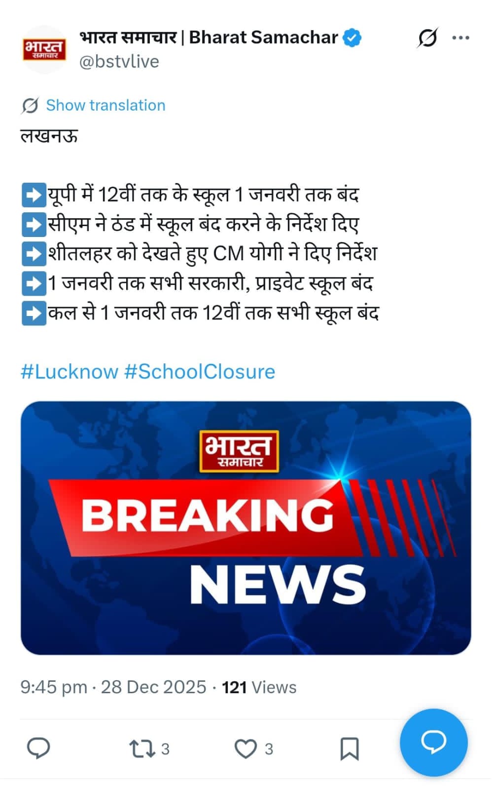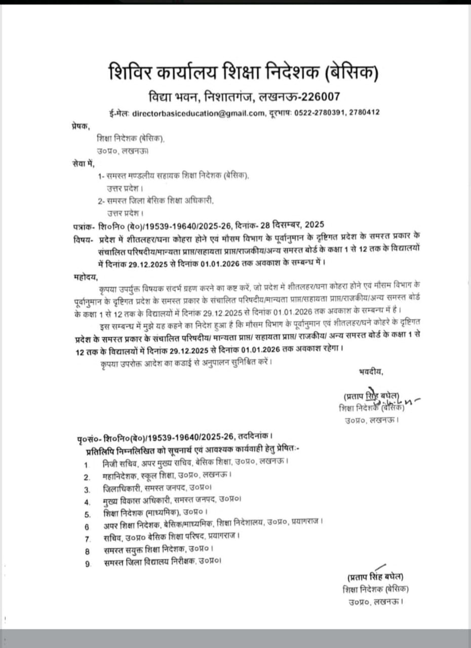भीषण शीतलहर को लेकर सभी 12वी तक के स्कूलों को एक जनवरी तक बंद करने के निर्देश