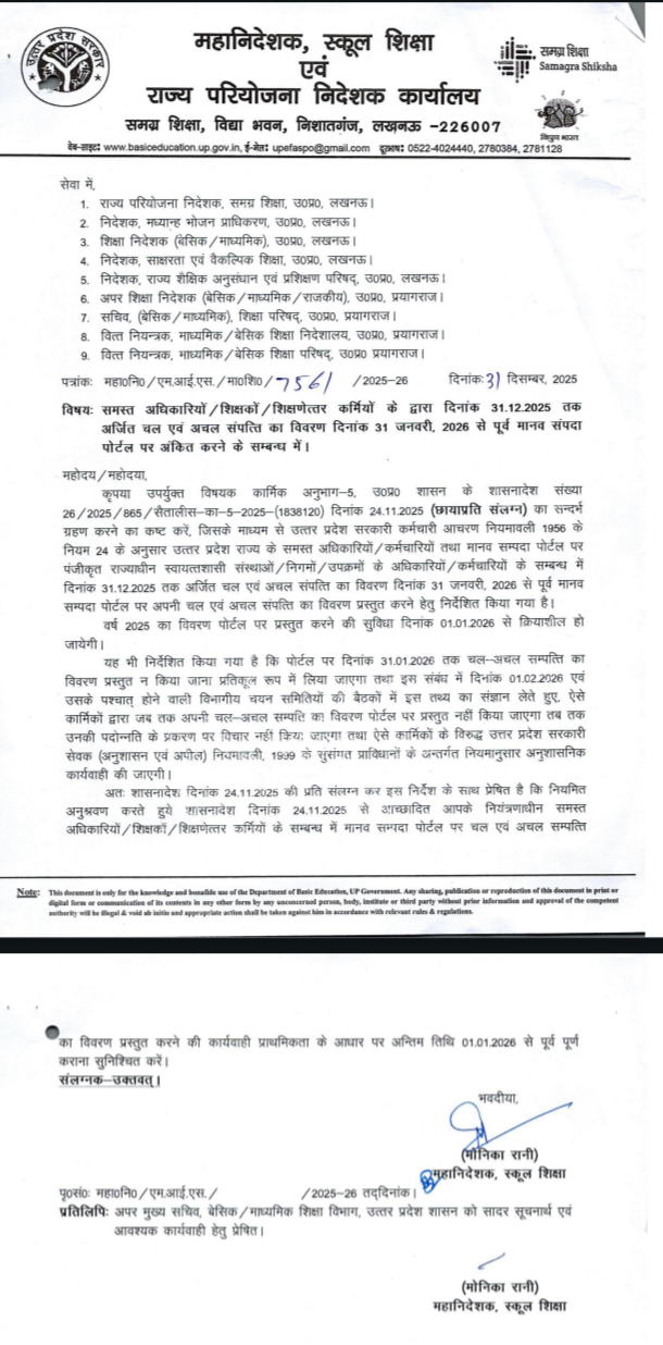 पोर्टल पर दिनांक 31.01.2026 तक चल-अचल सम्पत्ति का विवरण प्रस्तुत न किया जाना प्रतिकूल रूप में लिया जाएगा